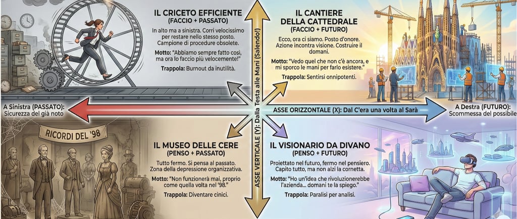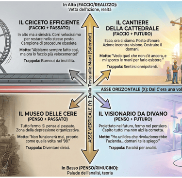 Il Cantiere della Cattedrale (in alto a destra). Anche una cattedrale può essere un museo, ma innanzitutto è una casa da vivere e condividere. Qui l'azione incontra la visione. Non stai solo spostando sassi (azione pura) e non stai solo sognando guglie (pensiero sterile). Stai costruendo il domani. Per viverci bene devo vedere ciò che non c’è ancora e volere sporcarsi le mani perché possa esistere. Il rischio più consistente: sentirsi onnipotenti per tanta generatività, dobbiamo ricordarci che le cattedrali oltre alle guglie hanno necessità di solide fondamenta (un po' di realismo dal basso).